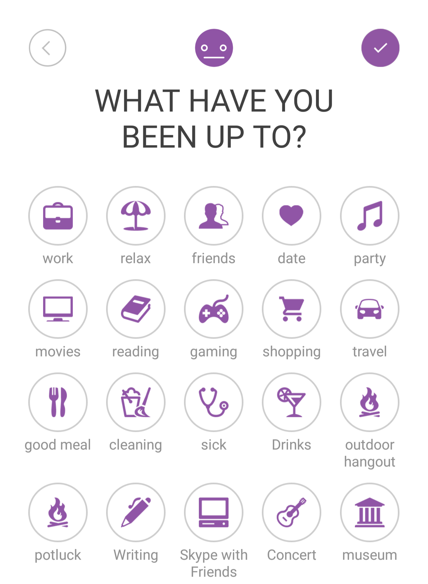 You can add your own, but the main ones are Work, Relax, Study, Family, Friends, etc. You can add whatever you want and there are a bunch of icons to choose from too. I have mine fully customized since using the app since March 2016 (2 whole years!).