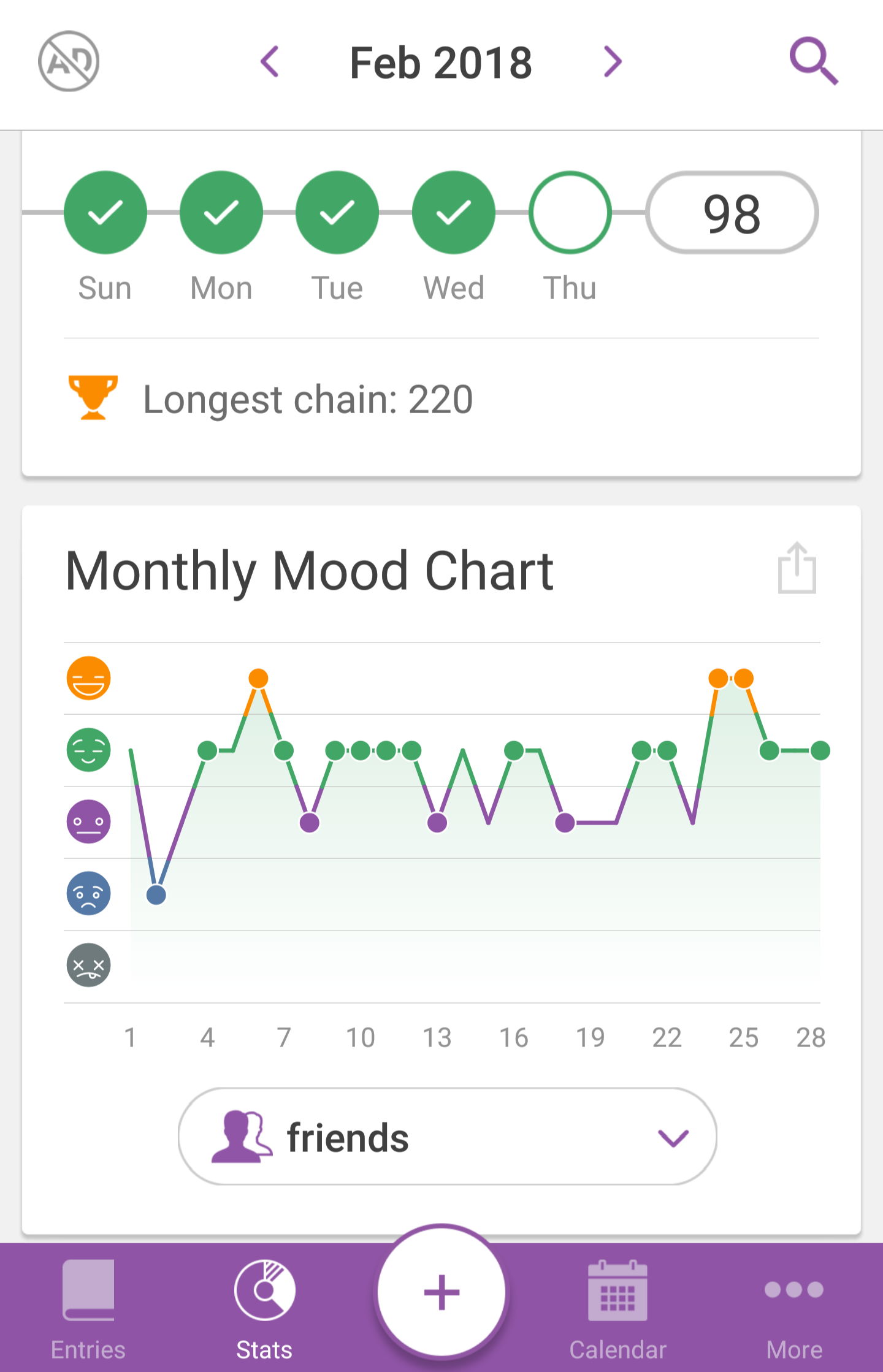 The mood chart is probably one of my favorite features because you can search for activities throughout the chart. Here, I searched for when I hung out with “friends,” which to me could also be just talking to someone on the phone. Seems like it doesn’t affect my mood that much. I also track my period on the app, so I can see when I was on it and how it correlated to my mood that day (damn hormones!) You don’t have to use it for depression.